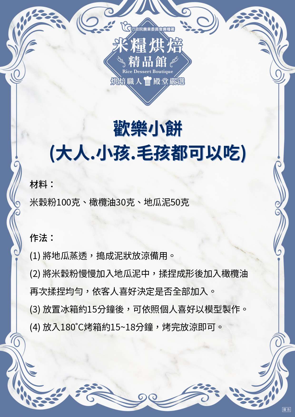 米穀粉100克、橄欖油30克、地瓜泥5克