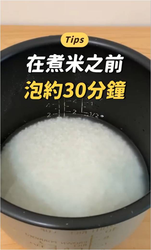2.在煮米之前泡約30分鐘,讓米充分吸水,可增加飯粒甘甜味及黏彈性