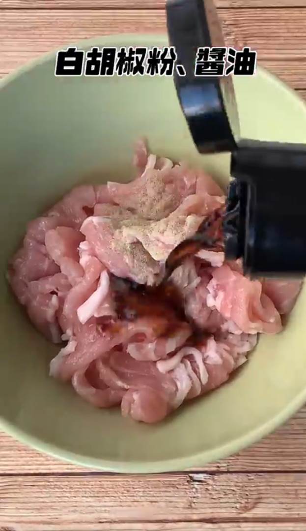 1.先在盆中,加入豬肉片、白胡椒粉、醬油,抓醃一下備用。