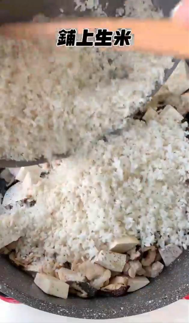 3.鋪上生米,上蓋燉煮一下,約10分鐘後把高麗菜加進去,再煮10分鐘。