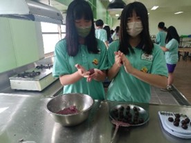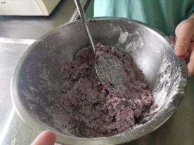 2.取50公克米糰,包裹20公克豆沙餡,揉圓,白色漿糰表面沾裹黑白芝麻(兩色),搭配抹茶水、純水、胡蘿蔔汁、葡萄汁三色,不沾芝麻。