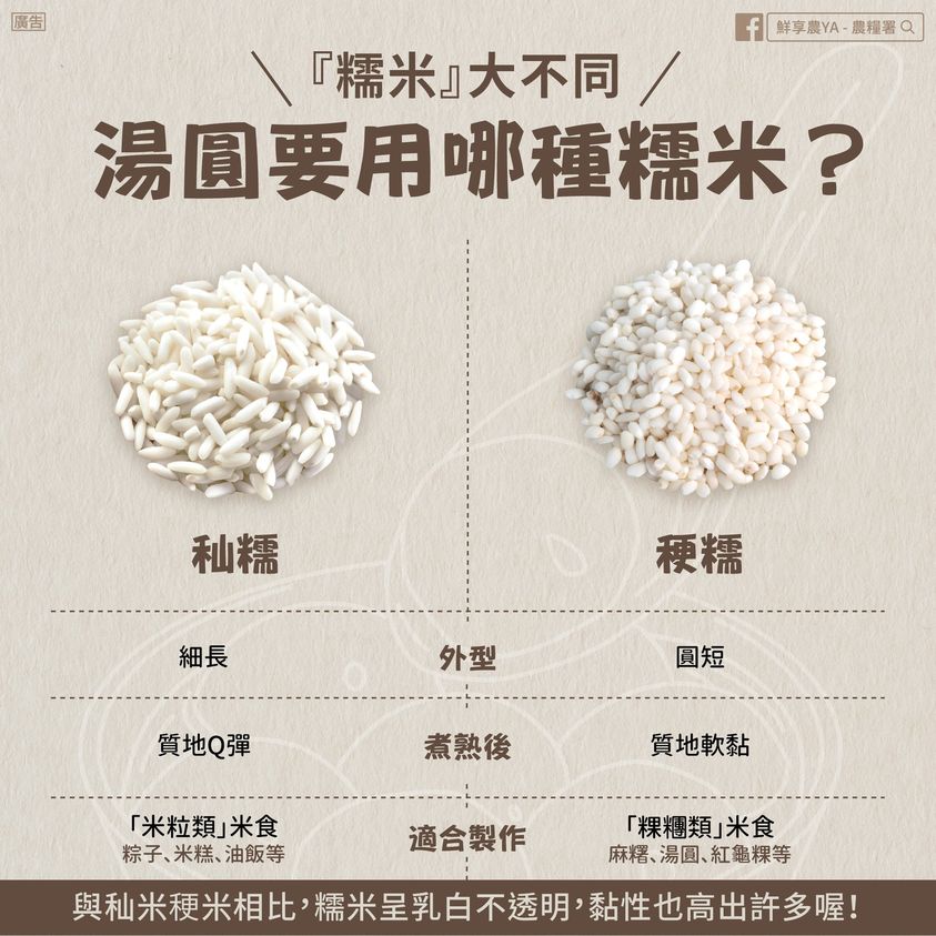 傳統節慶~絕對少不了「糯米」的美味身影 糯米的支鏈澱粉含量高,烹煮後具軟黏特性,多用以製成各式節慶常用米食 常見糯米有秈糯和稉糯兩種 「秈糯(長糯)」米型細長,適合製作「米粒類」米食 如:粽子、米糕、油飯等 「稉糯(圓糯)」米型圓短,適合製作「粿糰類」米食 如:麻糬、湯圓、紅龜粿等 糯米性溫和,適合溫補脾胃,請多使用最在地、最新鮮的國產糯米做為節慶米食的主原料喔!
