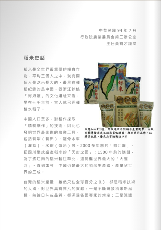 稻米是全世界最重要的糧食作物,平均三個人之中,就有兩個人是吃米長大的。最早有種稻紀錄的是中國。從浙江餘燃「河姆渡」的文化遺址來看。早在七千年前,古人就已經種植水稻了。