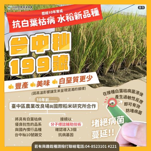 ◎水稻台中秈199號目前已公告開放技轉,並正在處於植物品種權申請的階段,有興趣的農民團體、產銷班或契作主體,可撥打聯絡電話:04-8523101 #221