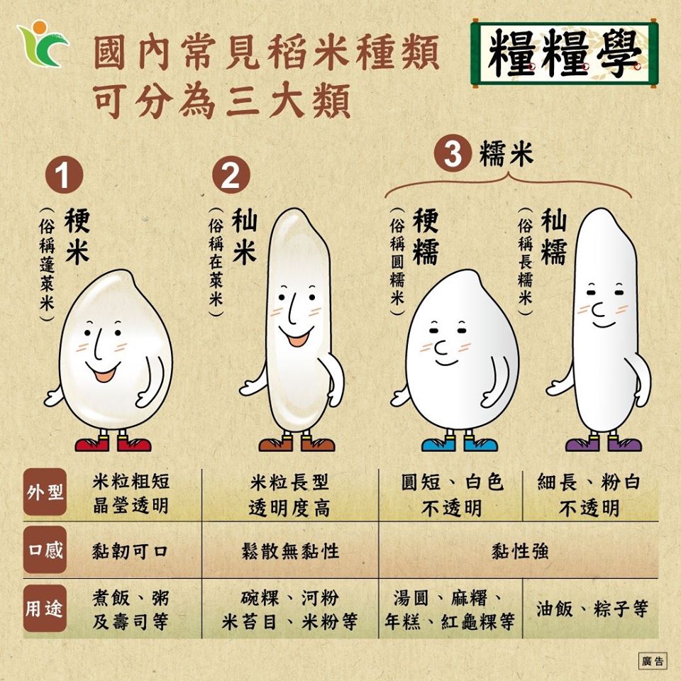 千變萬化的米食,是由哪一種米所製成的呢!? 答案就是「蓬萊米、在來米、糯米」這三大類喔!! ◎稉米(俗稱蓬萊米) 臺灣飯桌上常見的白米飯,口感適中有彈性。 ◎秈米(俗稱在來米) 像是大家喜愛的小吃:碗粿、河粉、米粉,都是用在來米,口感鬆散無黏性。 ◎糯米 1.分為秈糯(俗稱長糯米)、稉糯(俗稱圓糯米)。 2.大部分的粽子是由秈糯製成;其他傳統節慶米食,像是湯圓、年糕、紅龜粿等,則是由稉糯製成。 資料來源:鮮享農YA-農糧署