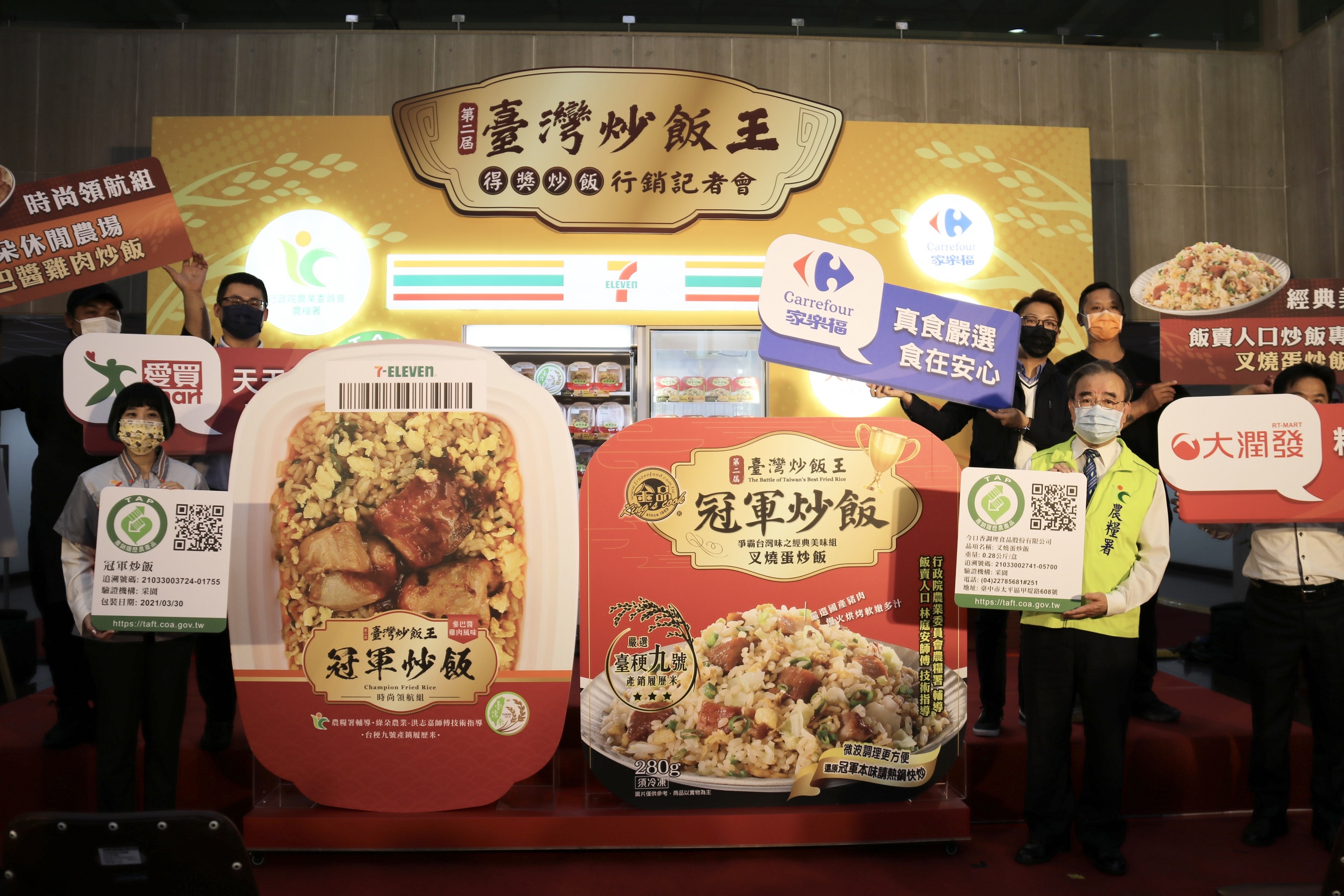農糧署表示,「叉燒蛋炒飯」將於4月7日至5月7日起,分三波陸續於7-ELEVEN、家樂福量販店、大潤發及愛買等通路銷售,「參巴醬雞肉炒飯」於4月7日起在7-ELEVEN獨家銷售,將以75–85元的銅板價提供消費者選購。7-ELEVEN為響應政府政策,新品上架期間推出專屬超殺折扣,「叉燒蛋炒飯」限量優惠價59元/份(原價75元/份,限量5萬份),「參巴醬雞肉炒飯」限量優惠價70元/份(原價85元/份,限量2萬份),低於70元的價格就能享用具產銷履歷驗證的美味,喜愛美食的消費者千萬不要錯過。由於第二屆臺灣炒飯王得獎炒飯,種類多元、風味獨樹一格,農糧署也協助7家業者將得獎炒飯於美食外送平臺Uber Eats銷售,消費者點選手機即可完成線上點餐,免出門快速享用得獎炒飯的絕妙好滋味。歡迎大家到各大通路及透過外送平臺,吃炒飯、挺在地,以實際行動支持國產米食。