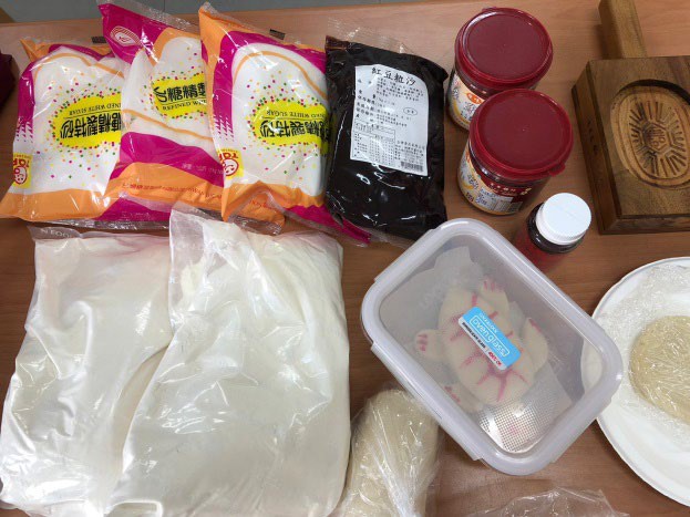 鳳片粉400g、水280g、砂糖560g、麥芽糖80g、紅色素0.4g、豆沙400g
